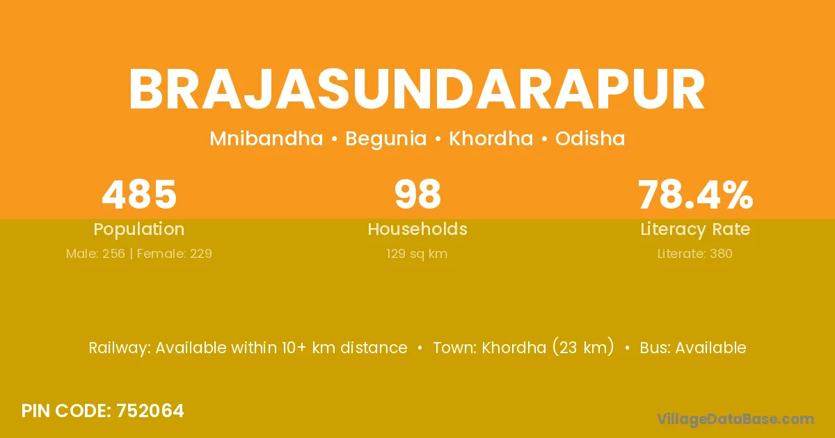 Brajasundarapur village has a total population of 485 people, of which 256 are males and 229 are females.