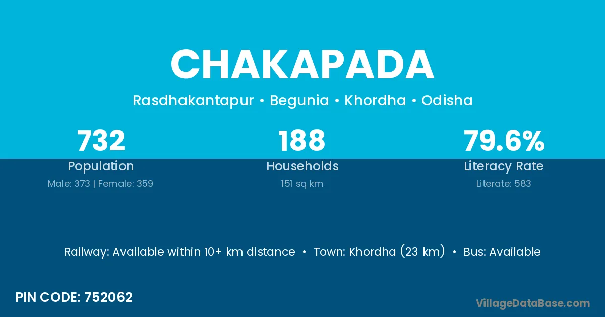 Chakapada village has a total population of 732 people, of which 373 are males and 359 are females.