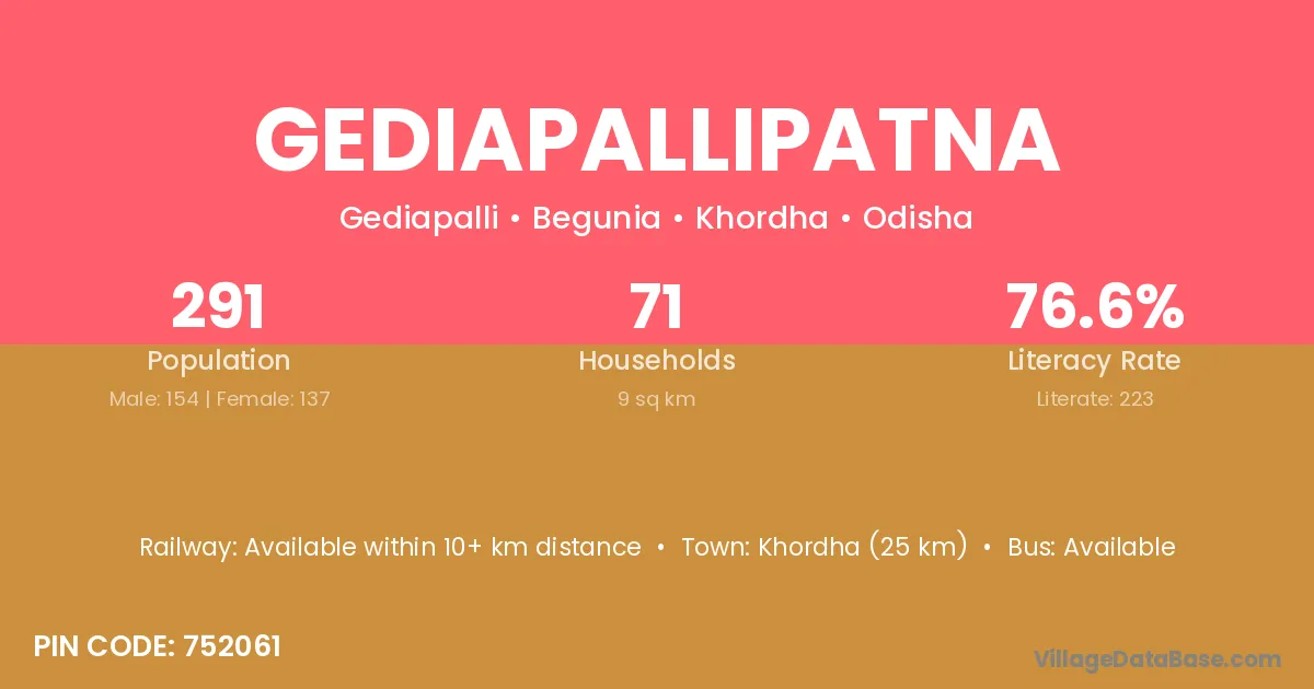 Khordha (25 km) is the nearest town to Gediapallipatna village for major economic activities and is located approximately 25 km away.