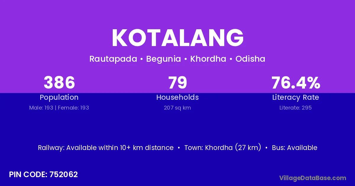 Khordha (27 km) is the nearest town to Kotalang village for major economic activities and is located approximately 27 km away.