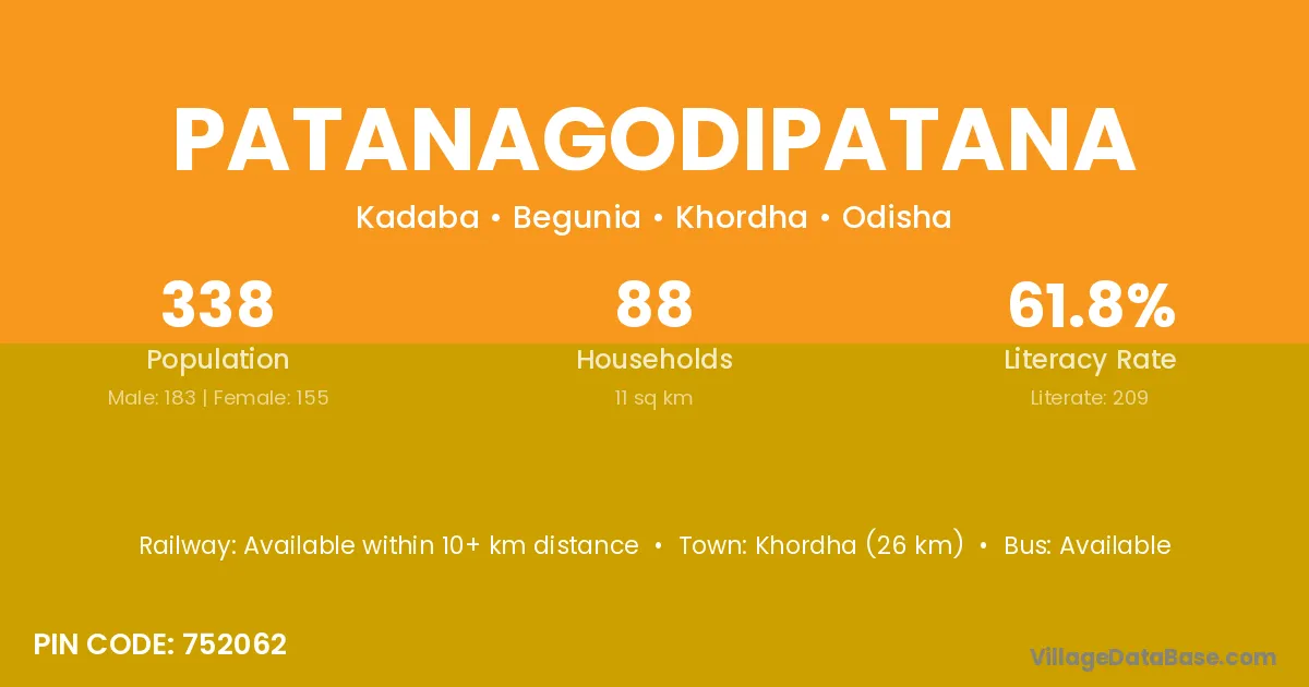 Khordha (26 km) is the nearest town to Patanagodipatana village for major economic activities and is located approximately 26 km away.