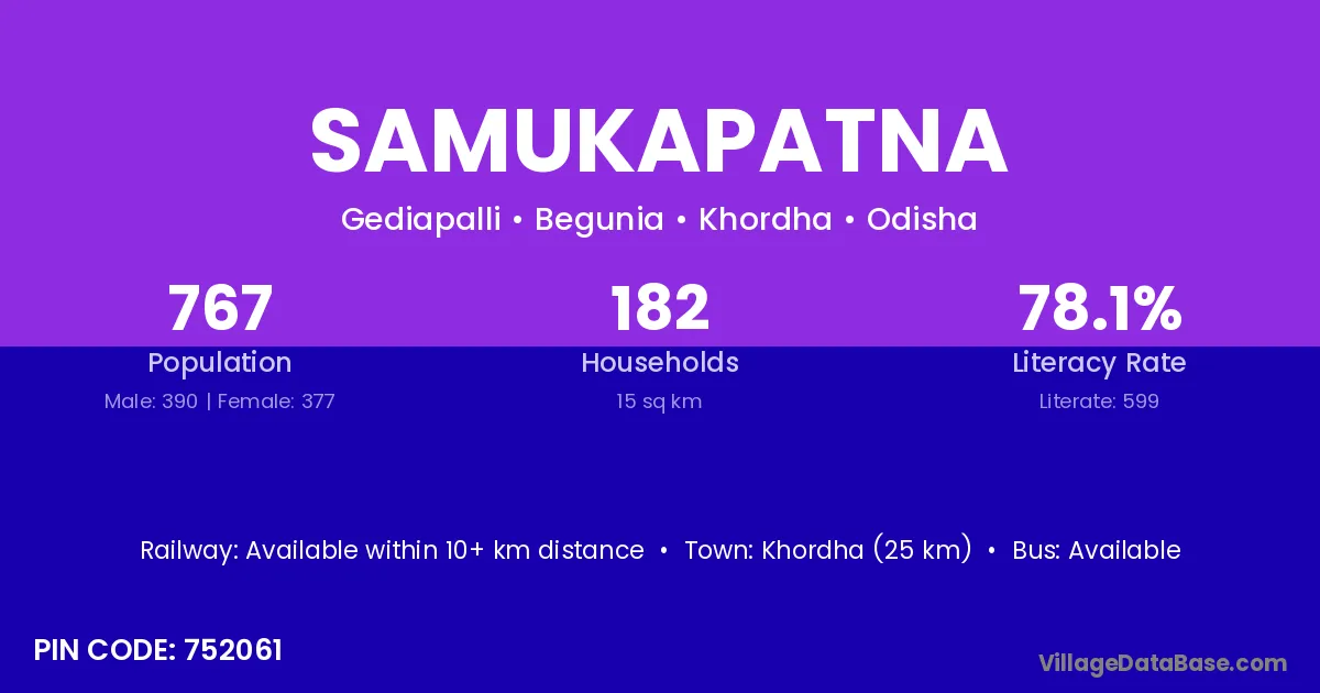 Khordha (25 km) is the nearest town to Samukapatna village for major economic activities and is located approximately 25 km away.