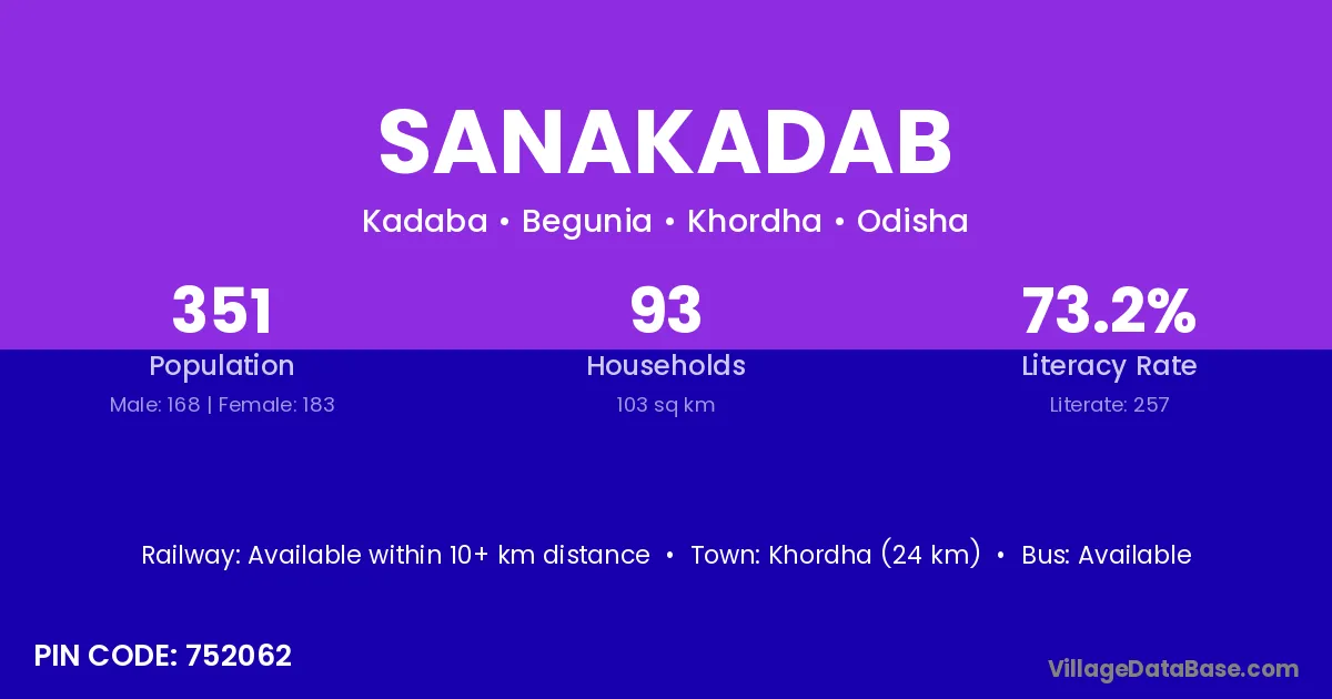 Khordha (24 km) is the nearest town to Sanakadab village for major economic activities and is located approximately 24 km away.