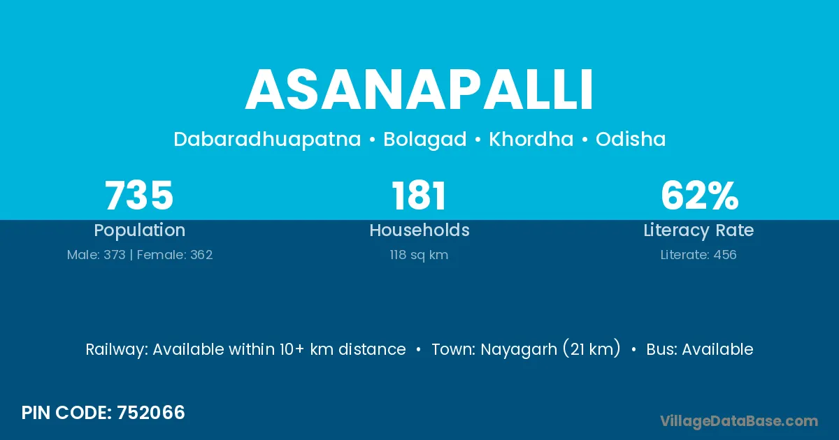 Nayagarh (21 km) is the nearest town to Asanapalli village for major economic activities and is located approximately 21 km away.