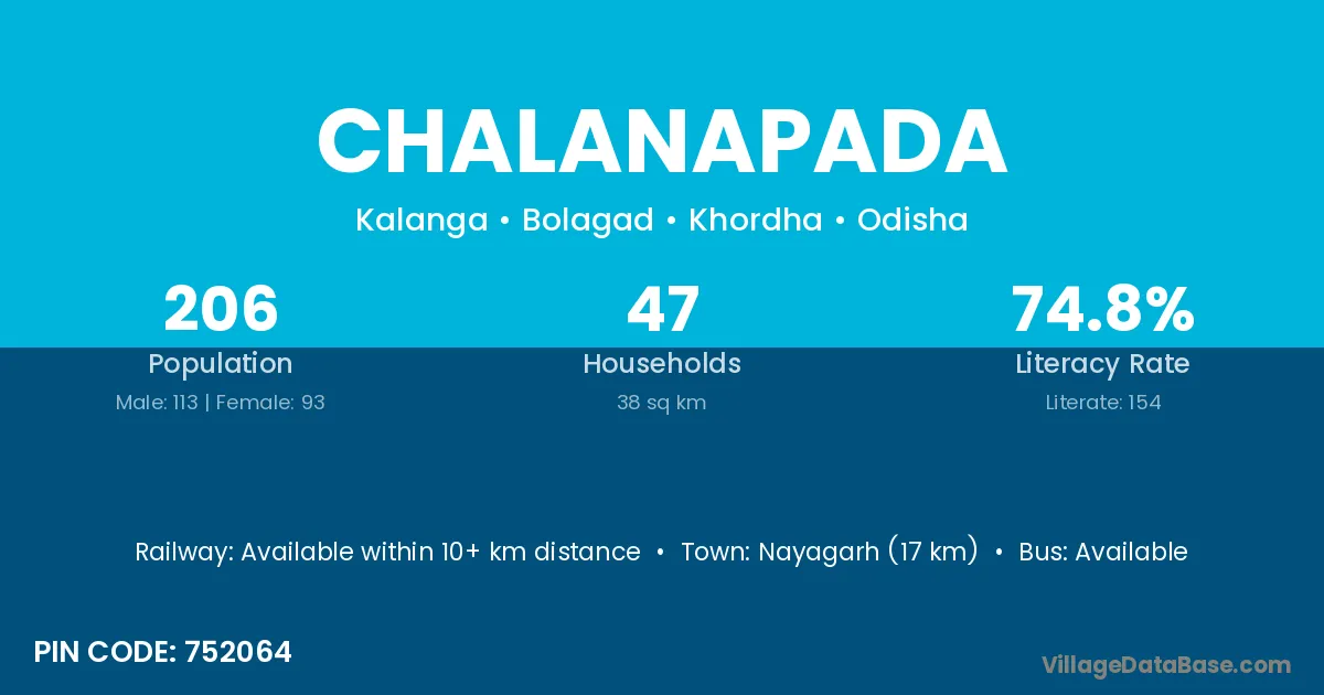 Nayagarh (17 km) is the nearest town to Chalanapada village for major economic activities and is located approximately 17 km away.
