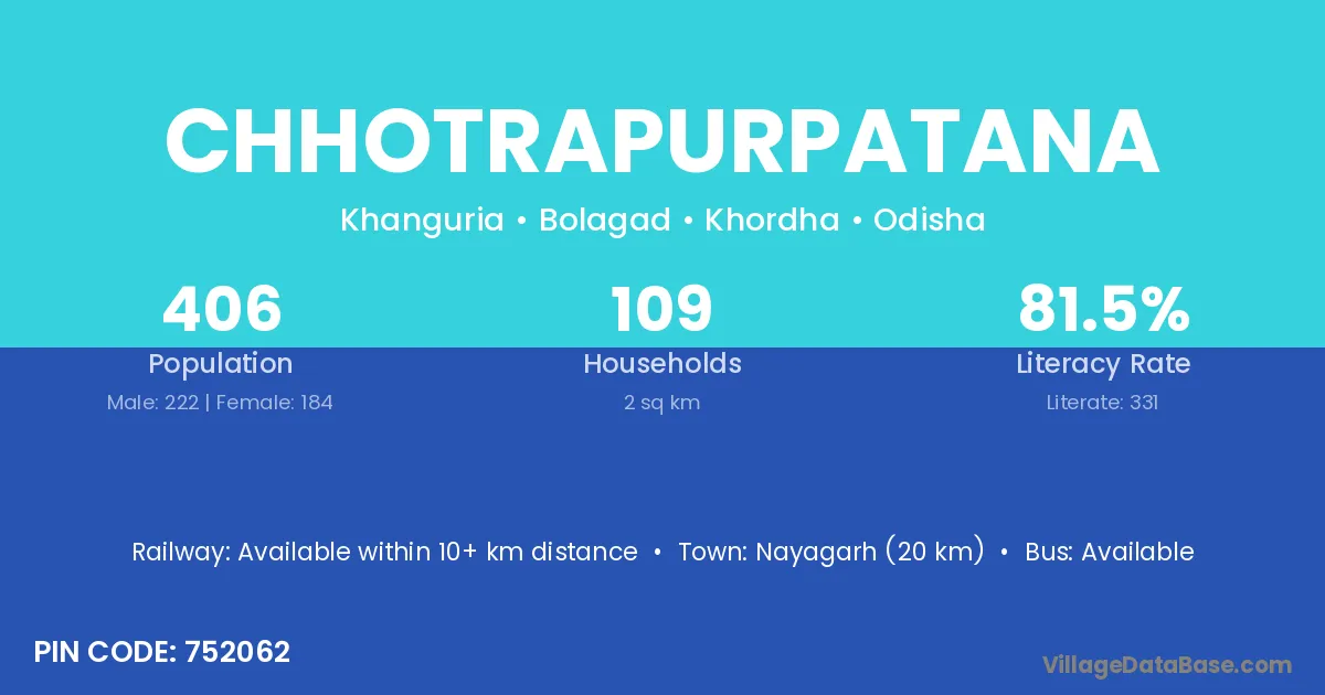 Nayagarh (20 km) is the nearest town to Chhotrapurpatana village for major economic activities and is located approximately 20 km away.