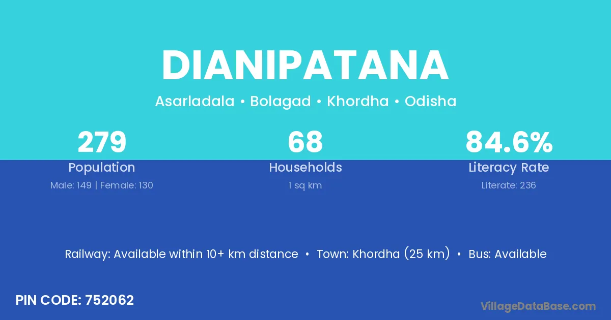 Khordha (25 km) is the nearest town to Dianipatana village for major economic activities and is located approximately 25 km away.
