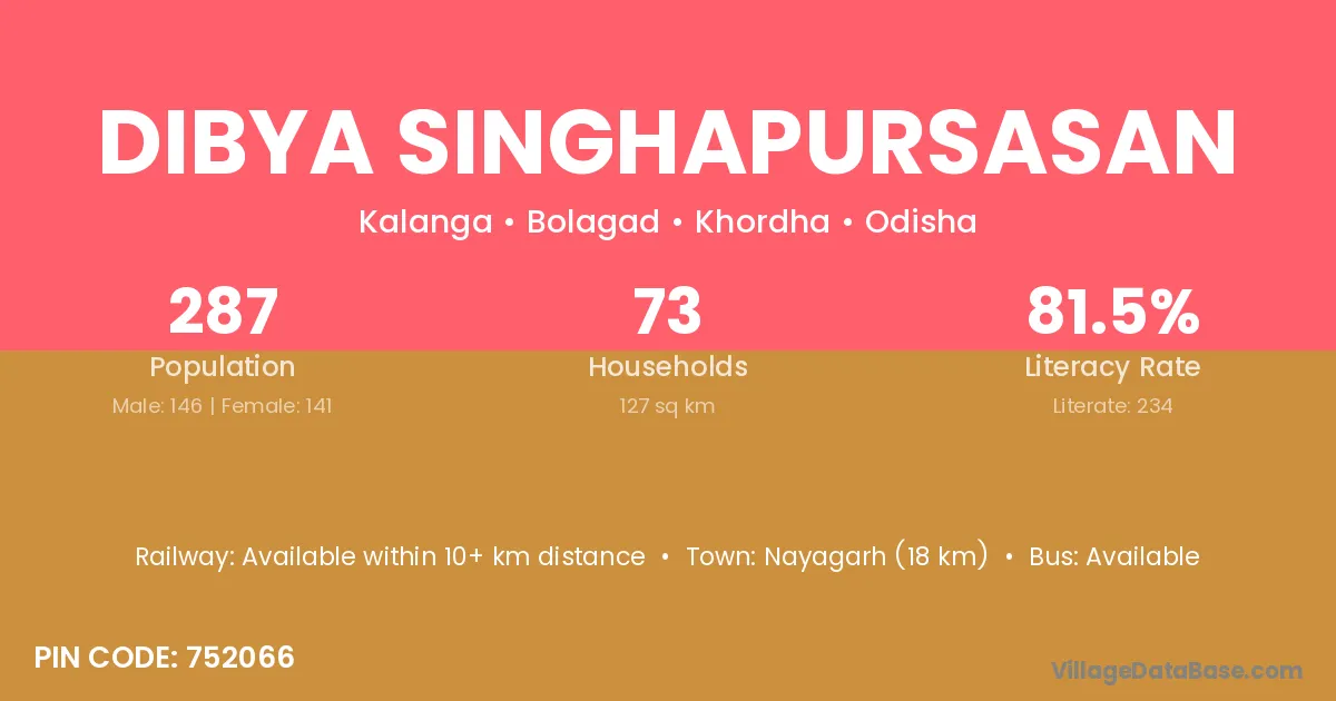 Dibya Singhapursasan village has a total population of 287 people, of which 146 are males and 141 are females.