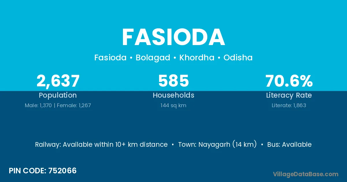 Nayagarh (14 km) is the nearest town to Fasioda village for major economic activities and is located approximately 14 km away.