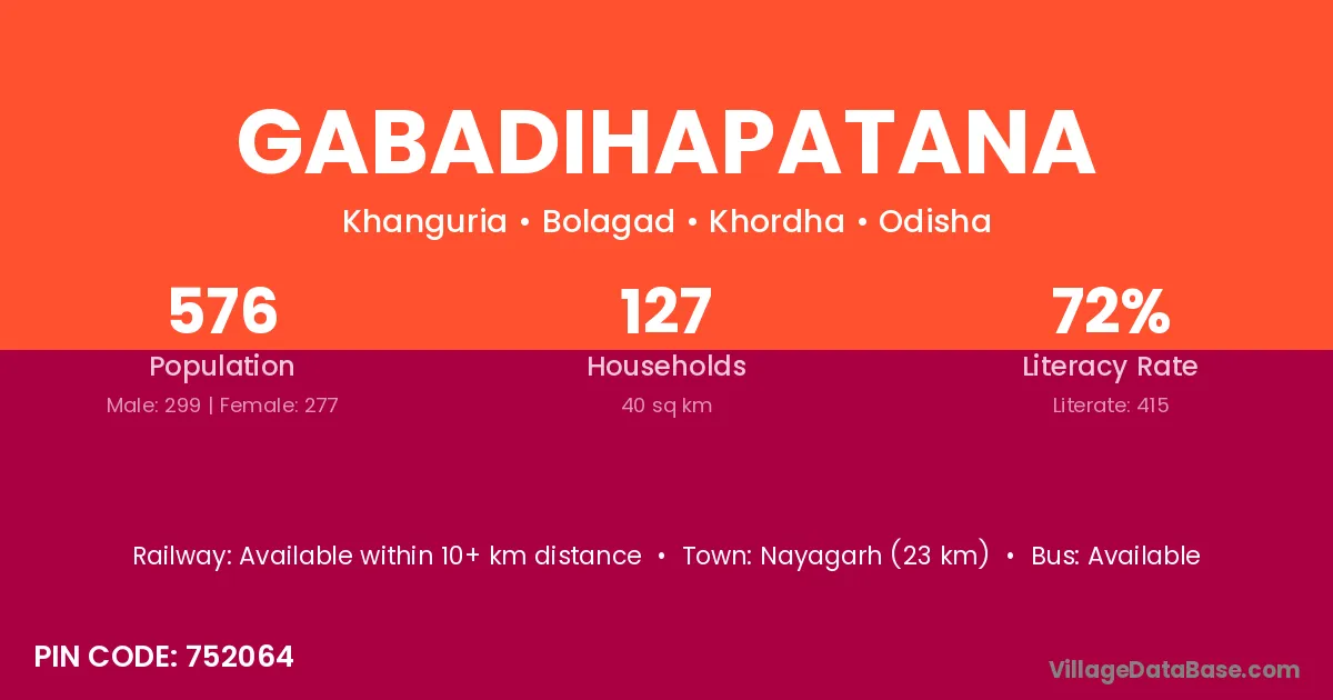 Nayagarh (23 km) is the nearest town to Gabadihapatana village for major economic activities and is located approximately 23 km away.