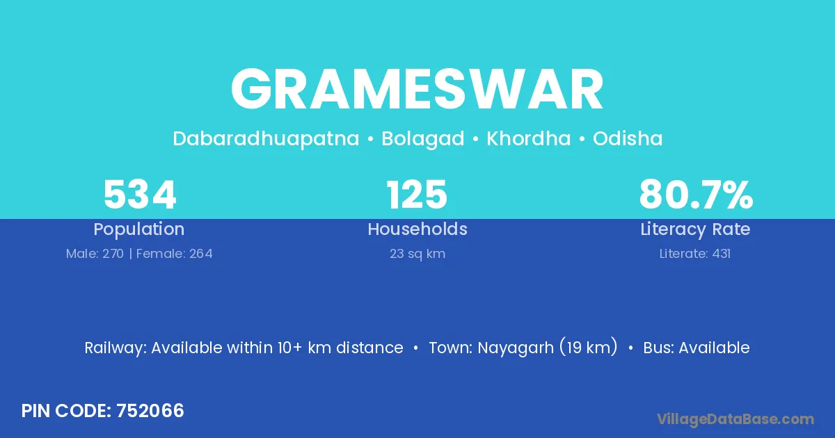 Nayagarh (19 km) is the nearest town to Grameswar village for major economic activities and is located approximately 19 km away.