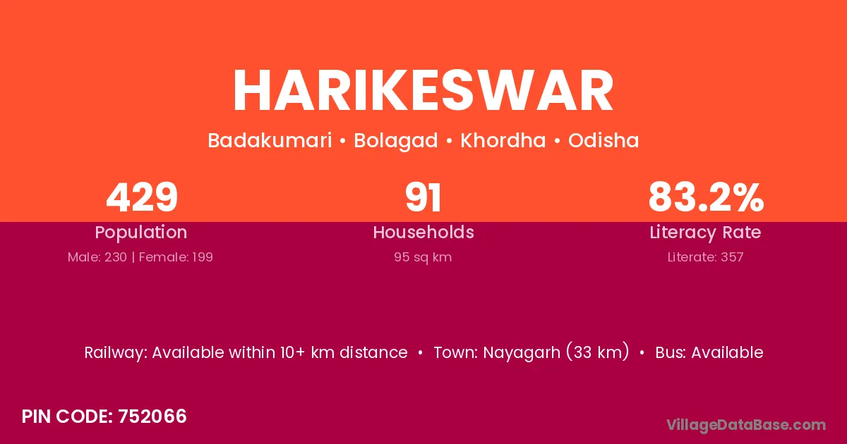 Nayagarh (33 km) is the nearest town to Harikeswar village for major economic activities and is located approximately 33 km away.