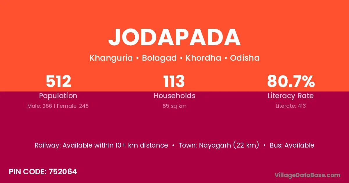 Nayagarh (22 km) is the nearest town to Jodapada village for major economic activities and is located approximately 22 km away.