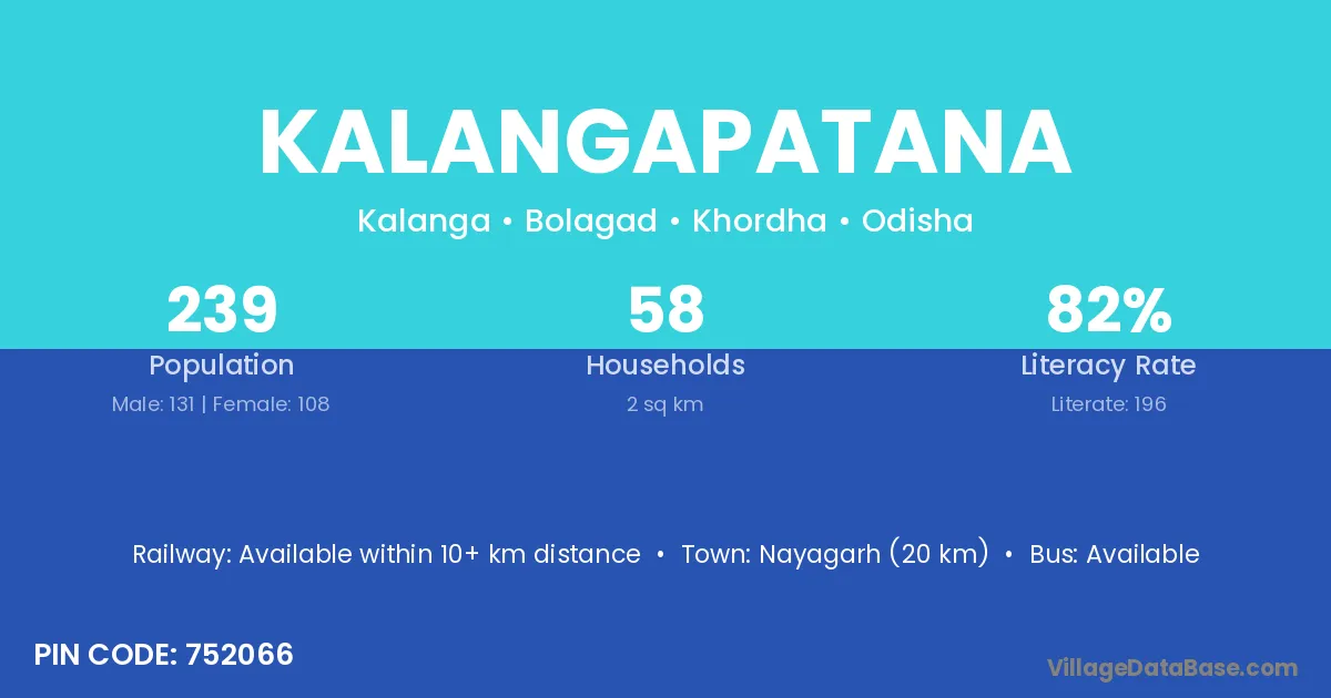 Nayagarh (20 km) is the nearest town to Kalangapatana village for major economic activities and is located approximately 20 km away.