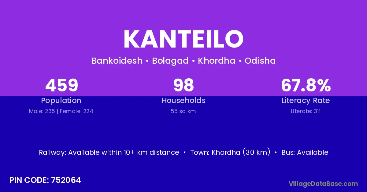 Khordha (30 km) is the nearest town to Kanteilo village for major economic activities and is located approximately 30 km away.