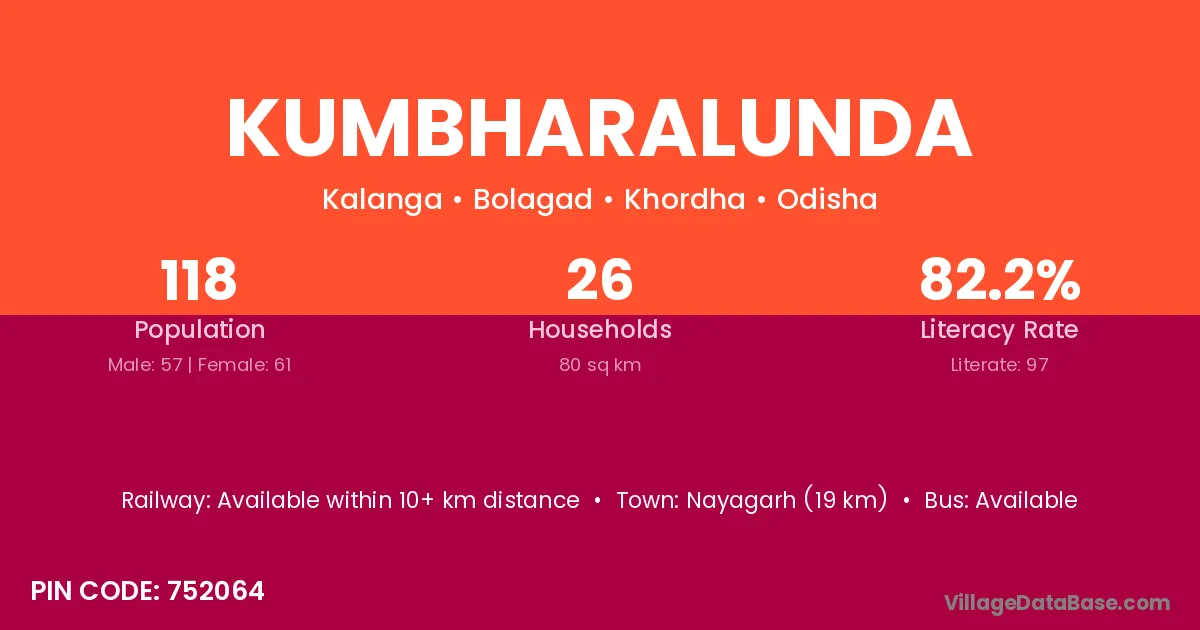 Nayagarh (19 km) is the nearest town to Kumbharalunda village for major economic activities and is located approximately 19 km away.