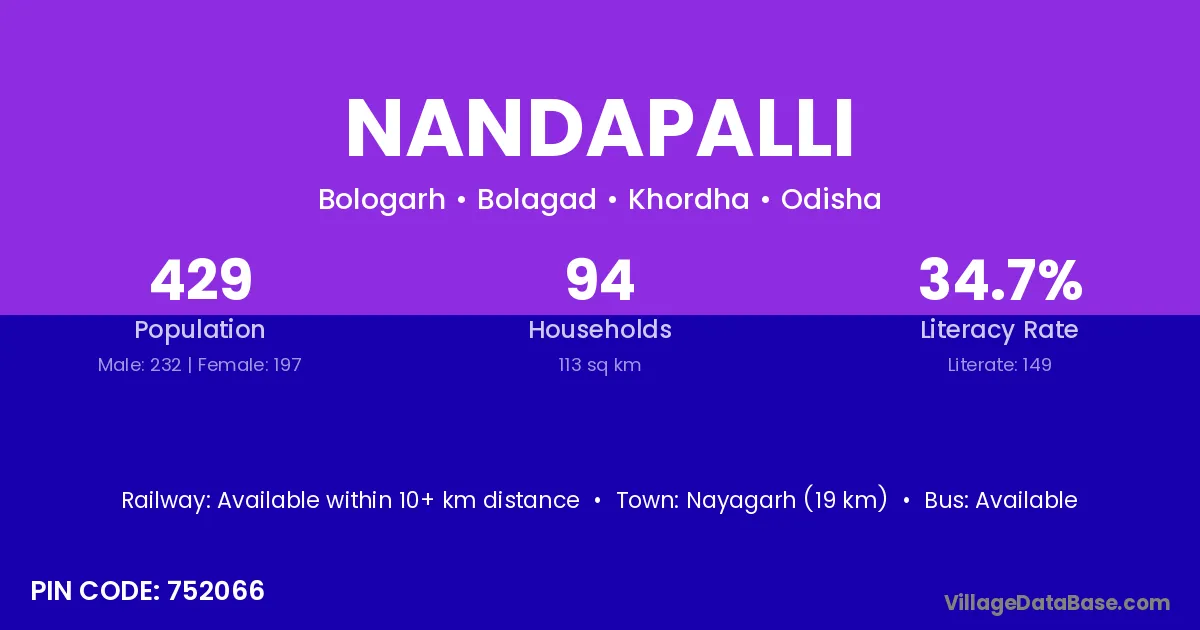 Nayagarh (19 km) is the nearest town to Nandapalli village for major economic activities and is located approximately 19 km away.