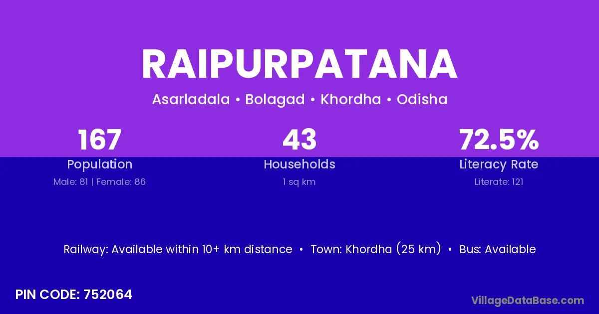 Khordha (25 km) is the nearest town to Raipurpatana village for major economic activities and is located approximately 25 km away.