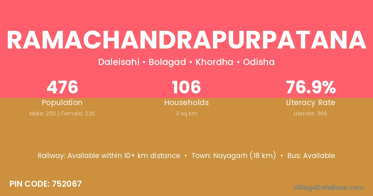Nayagarh (18 km) is the nearest town to Ramachandrapurpatana village for major economic activities and is located approximately 18 km away.