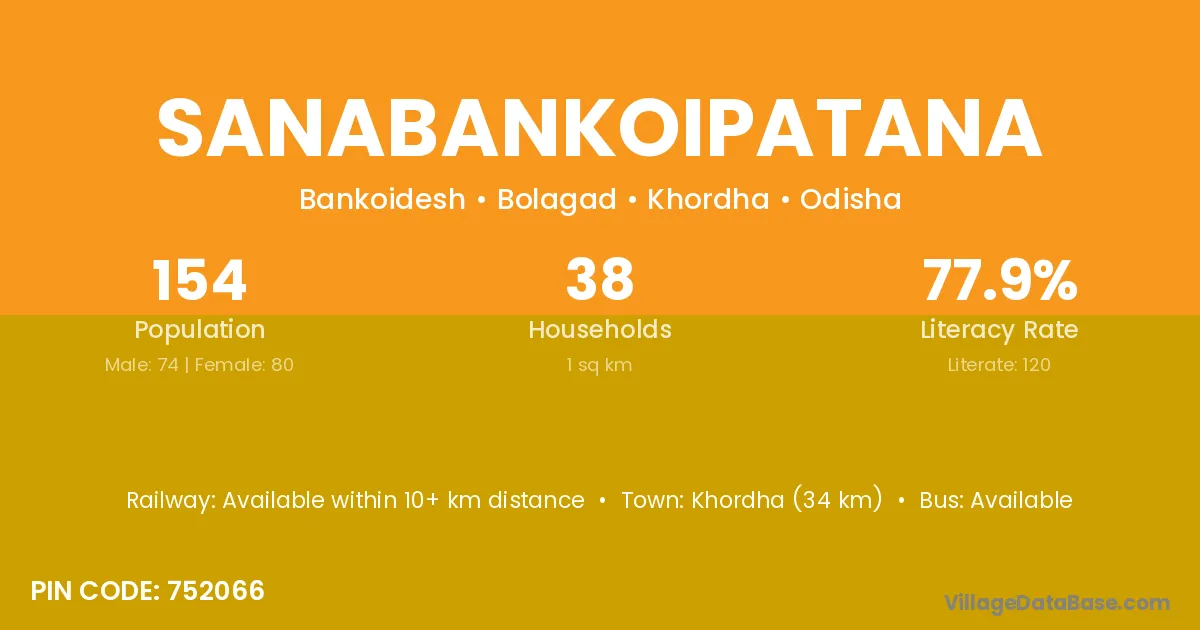 Khordha (34 km) is the nearest town to Sanabankoipatana village for major economic activities and is located approximately 34 km away.