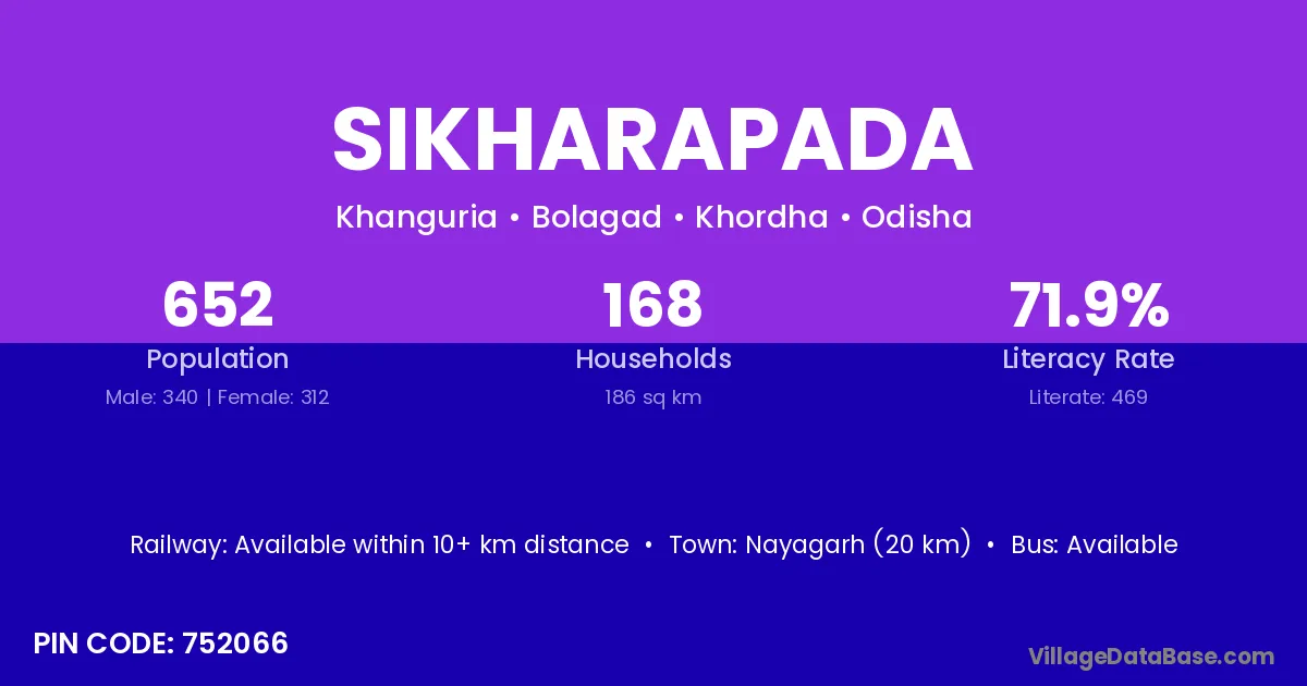 Nayagarh (20 km) is the nearest town to Sikharapada village for major economic activities and is located approximately 20 km away.