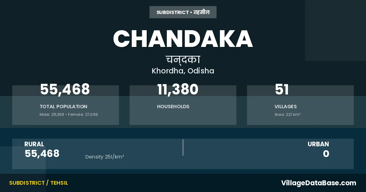 Chandaka is a town and Tehsil in the Khordha district of the Odisha. In India, a Tehsil is a subdivision of a district responsible for the administration and revenue collection of a specific area within the district. Tehsils play a crucial role in the local governance structure, contributing significantly to the development and administration of their communities.