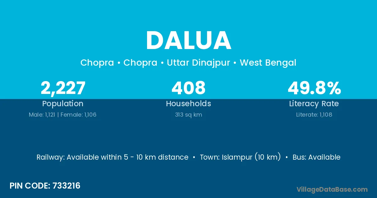 Khordha (28 km) is the nearest town to Dalua village for major economic activities and is located approximately 28 km away.