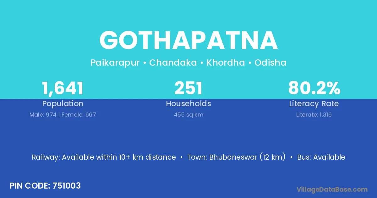 Bhubaneswar (12 km) is the nearest town to Gothapatna village for major economic activities and is located approximately 12 km away.