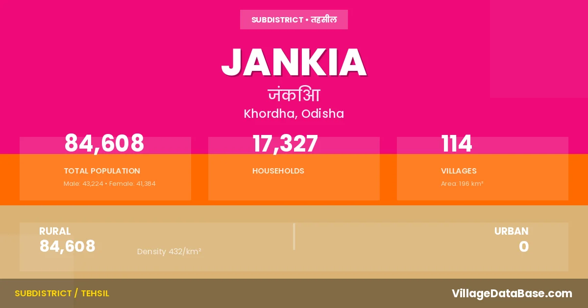 Jankia is a town and Tehsil in the Khordha district of the Odisha. In India, a Tehsil is a subdivision of a district responsible for the administration and revenue collection of a specific area within the district. Tehsils play a crucial role in the local governance structure, contributing significantly to the development and administration of their communities.