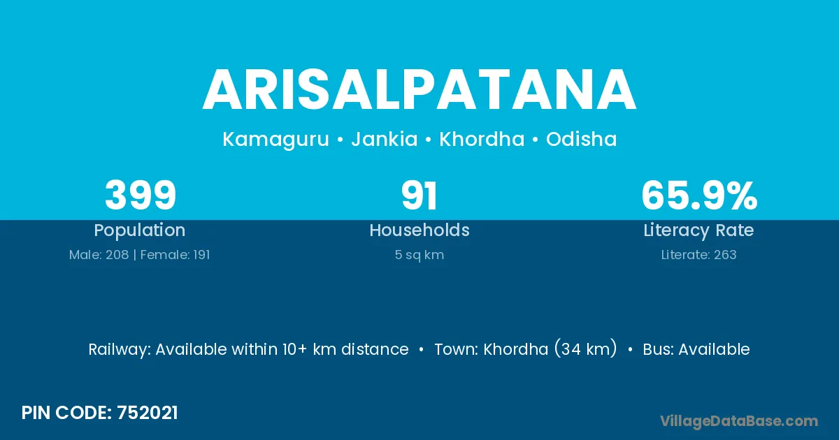 Khordha (34 km) is the nearest town to Arisalpatana village for major economic activities and is located approximately 34 km away.