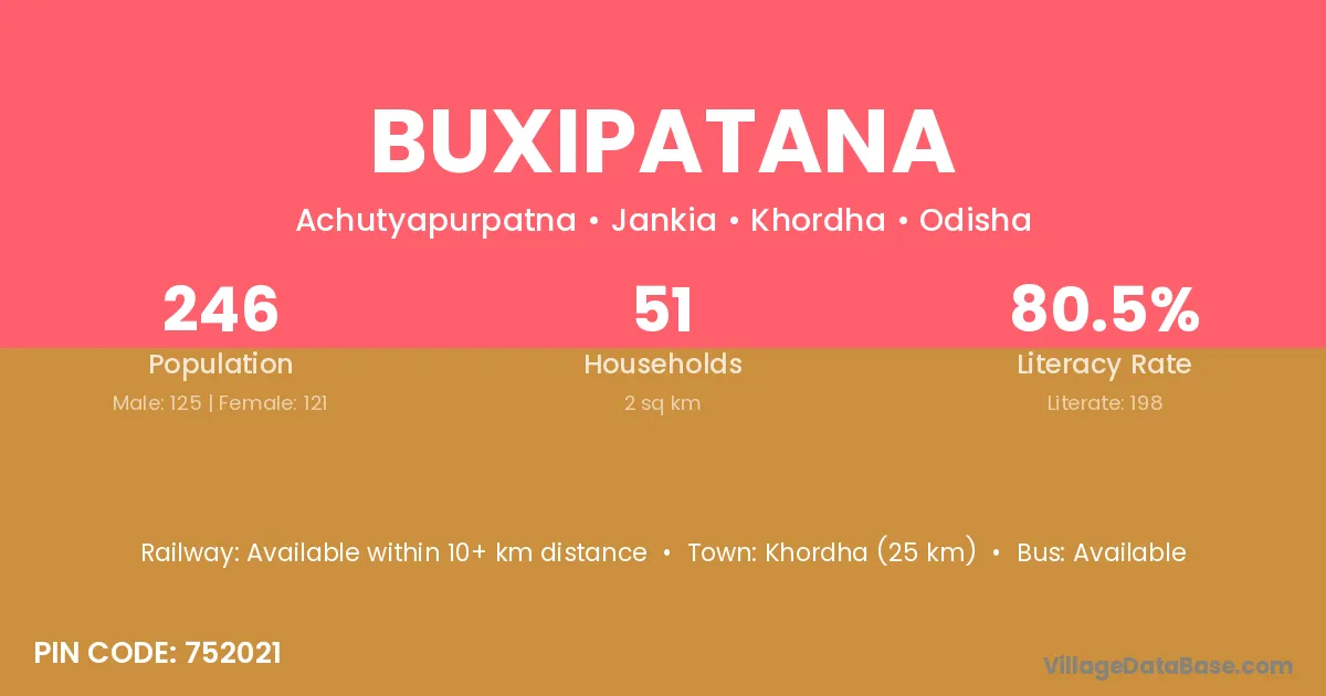 Buxipatana village has a total population of 246 people, of which 125 are males and 121 are females.