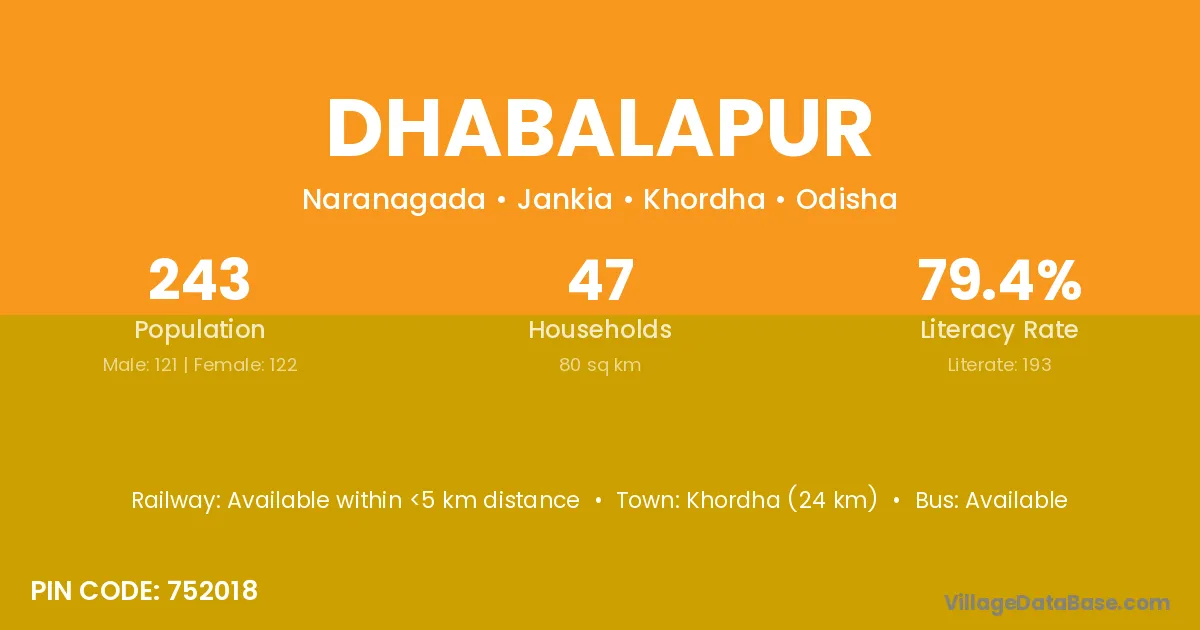 Khordha (24 km) is the nearest town to Dhabalapur village for major economic activities and is located approximately 24 km away.