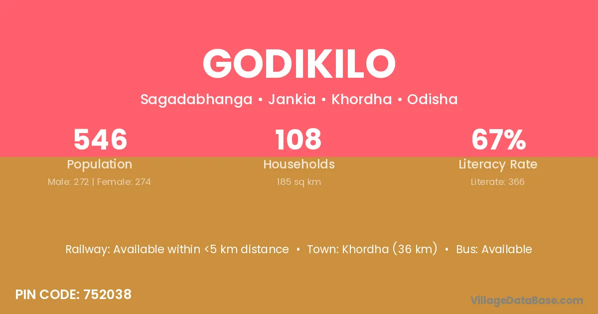 Khordha (36 km) is the nearest town to Godikilo village for major economic activities and is located approximately 36 km away.