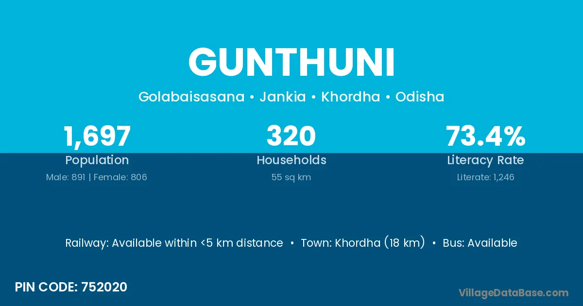 Khordha (18 km) is the nearest town to Gunthuni village for major economic activities and is located approximately 18 km away.