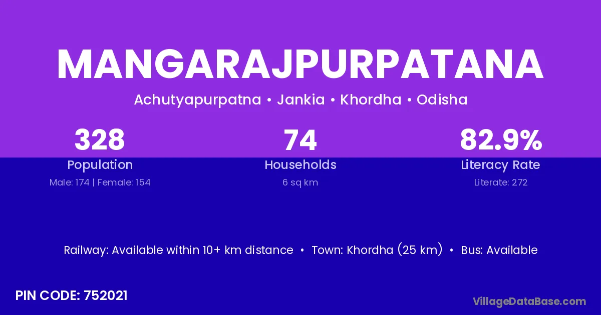 Khordha (25 km) is the nearest town to Mangarajpurpatana village for major economic activities and is located approximately 25 km away.