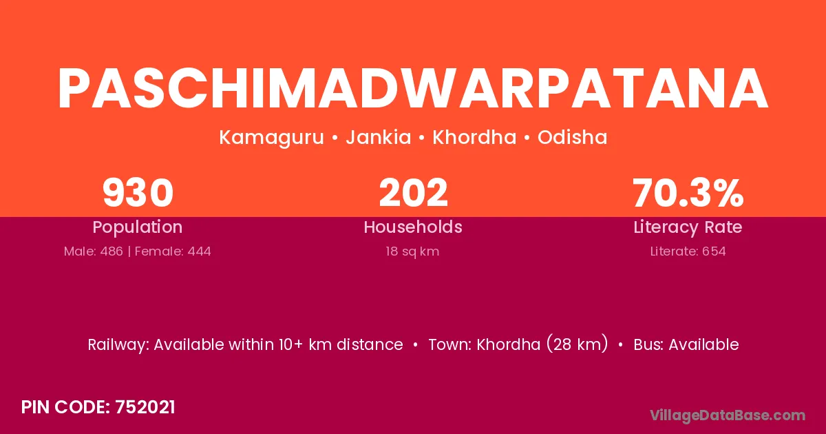 Khordha (28 km) is the nearest town to Paschimadwarpatana village for major economic activities and is located approximately 28 km away.