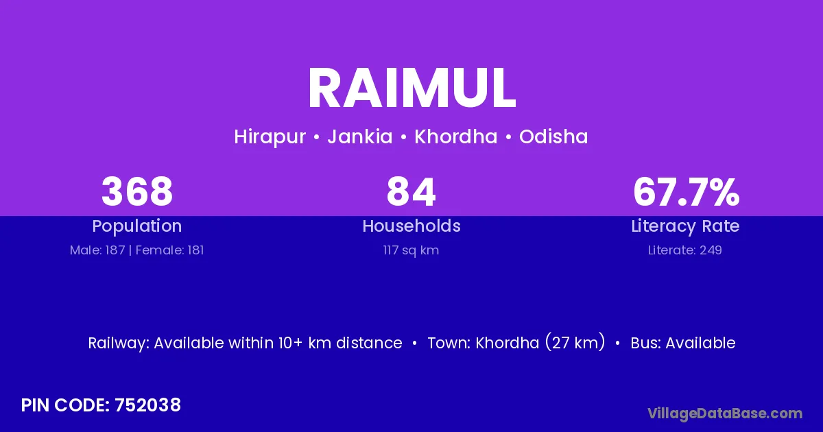 Khordha (27 km) is the nearest town to Raimul village for major economic activities and is located approximately 27 km away.