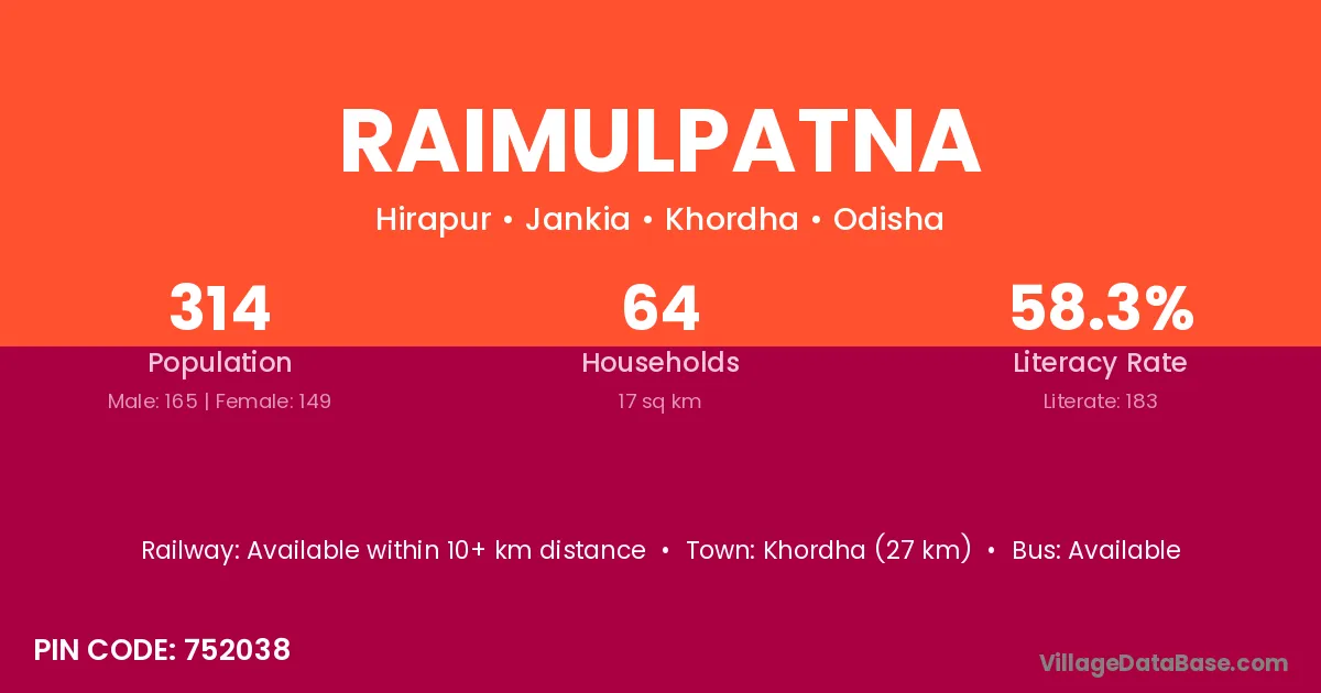 Khordha (27 km) is the nearest town to Raimulpatna village for major economic activities and is located approximately 27 km away.
