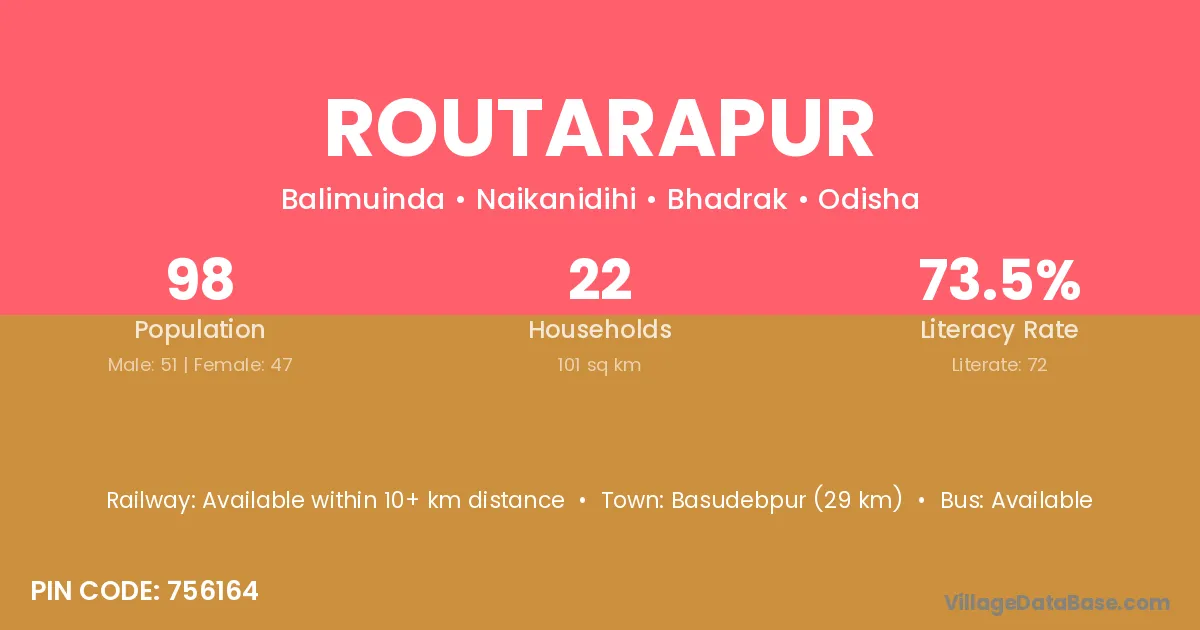 Khordha (23 km) is the nearest town to Routarapur village for major economic activities and is located approximately 23 km away.