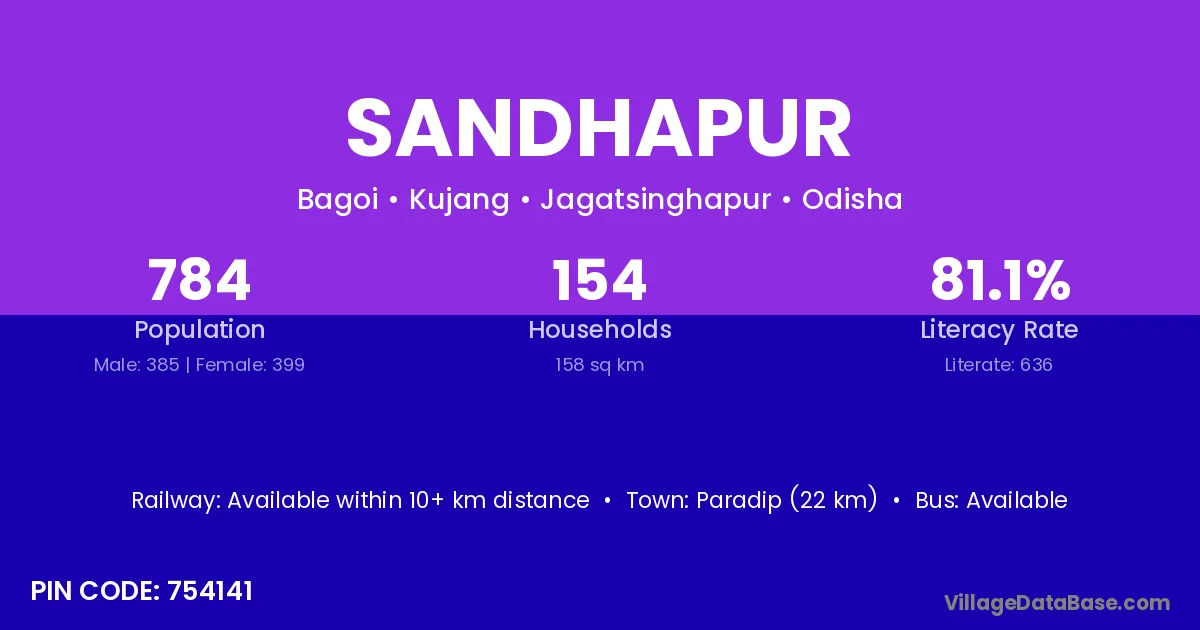 Khordha (26 km) is the nearest town to Sandhapur village for major economic activities and is located approximately 26 km away.