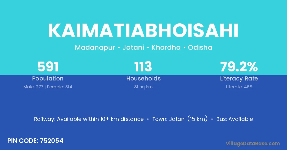 Jatani (15 km) is the nearest town to Kaimatiabhoisahi village for major economic activities and is located approximately 15 km away.