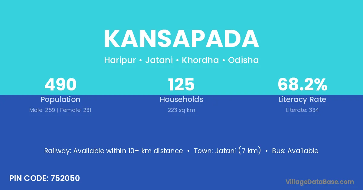 Jatani (7 km) is the nearest town to Kansapada village for major economic activities and is located approximately 7 km away.