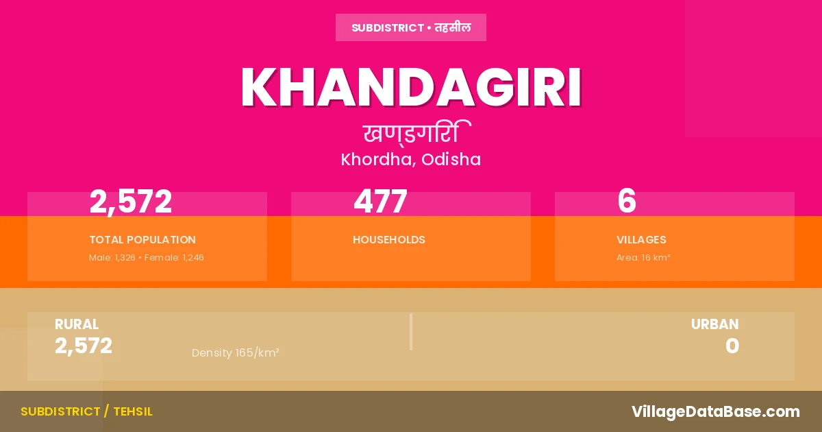 According to the 2011 census The total area of Khandagiri Tehsil is 16 km², with a population of 2572 people. The population density is 165 inhabitants per square kilometre, and there are approximately 477 houses in the sub district.