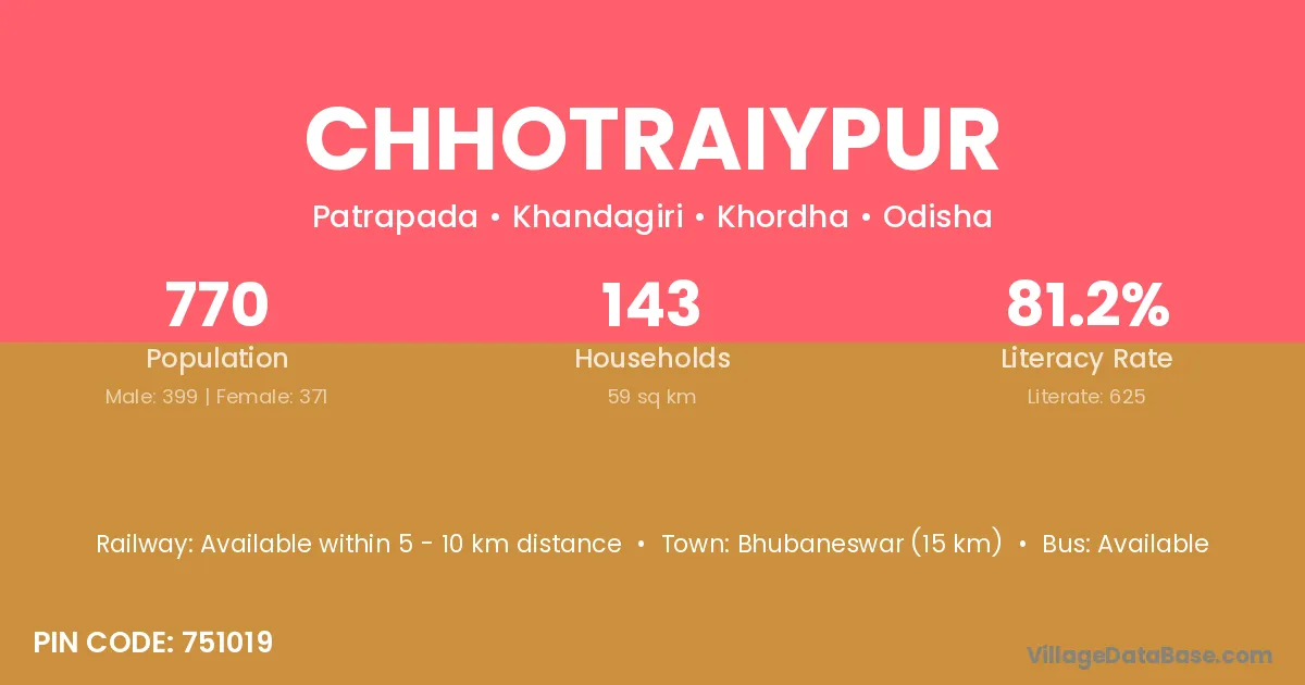 Bhubaneswar (15 km) is the nearest town to Chhotraiypur village for major economic activities and is located approximately 15 km away.