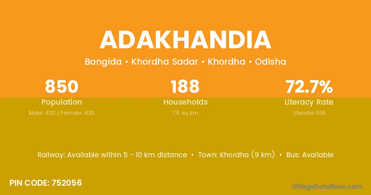 Khordha (9 km) is the nearest town to Adakhandia village for major economic activities and is located approximately 9 km away.