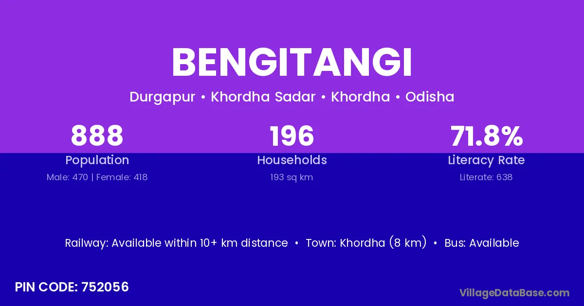 Khordha (8 km) is the nearest town to Bengitangi village for major economic activities and is located approximately 8 km away.