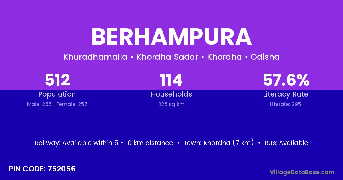 Khordha (7 km) is the nearest town to Berhampura village for major economic activities and is located approximately 7 km away.