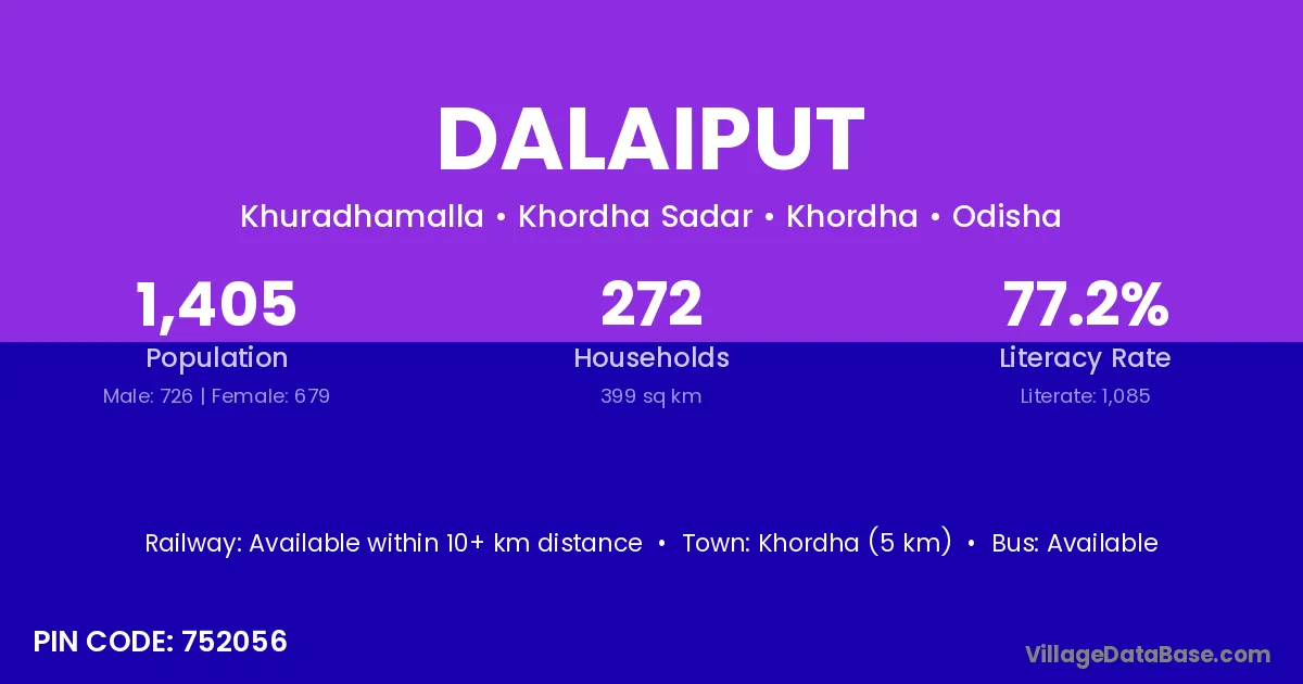 Khordha (5 km) is the nearest town to Dalaiput village for major economic activities and is located approximately 5 km away.