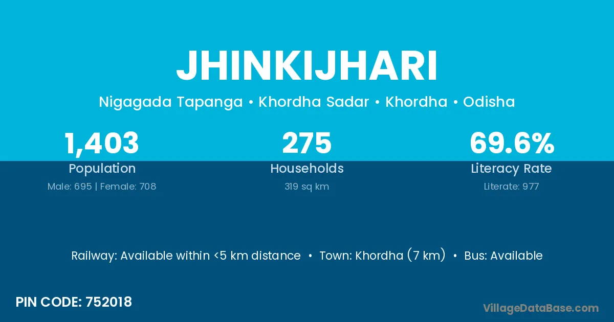 Khordha (7 km) is the nearest town to Jhinkijhari village for major economic activities and is located approximately 7 km away.