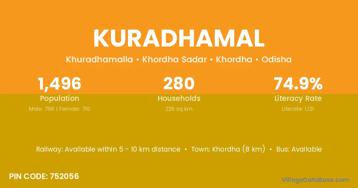 Khordha (8 km) is the nearest town to Kuradhamal village for major economic activities and is located approximately 8 km away.